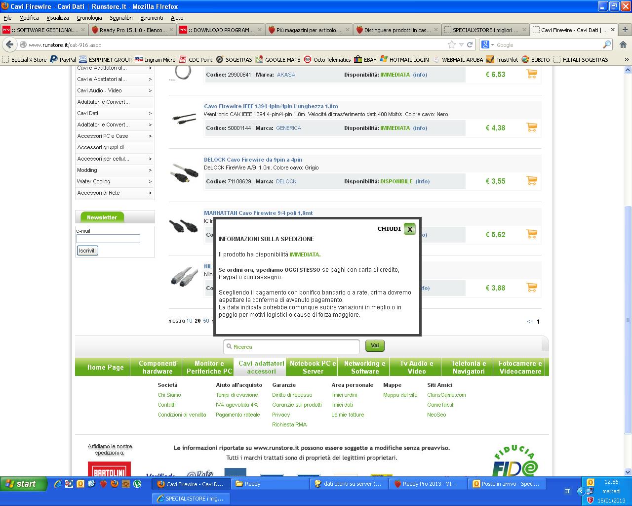 millstore.it - Chiede di poter "registrare" sul carrello i tempi di consegna previsti. Cioe' sul carrello memorizzare i tempi di consegna, cosi' che si possano consultare anche successivamente in caso di contestazioni da parte del cliente o per verifica (per capire che tempi ha visto il cliente sul sito) Questa e' la richiesta tra le 3 piu' fattibile e sui cui stiamo lavorando da un po' di tempo (la richiesta non e' nuova e gia' aperta qui: http://www.readypro.it/inserire-campo-libero-3.10.0.154056.fo.aspx ) Purtroppo anche qui la complessita' tecnica non e' da poco, ma tra le varie cose ci sembra la piu' utile per tutti gli utenti
