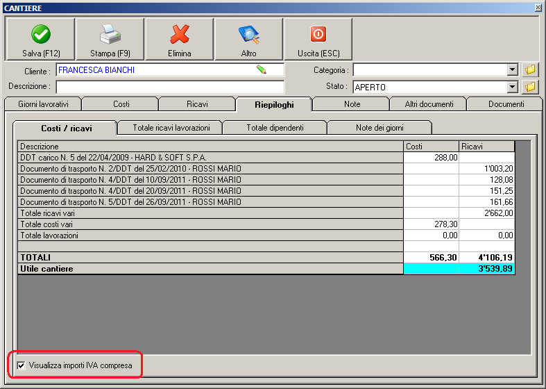 Modulo: Cantieri -Possibilita' di specificare dei costi liberi all'interno delle schede di lavoro -Possibilita' di visualizzare il riepilogo cantieri con importi IVA compresa