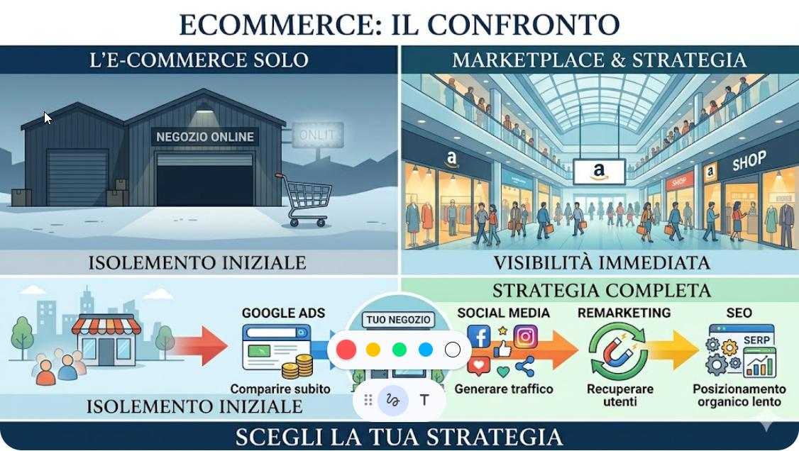 Aprire su un marketplace, invece, è come entrare in un centro commerciale: costa, ma offre una visibilità immediata e può essere una leva utile per partire, movimentare il magazzino e creare volumi.