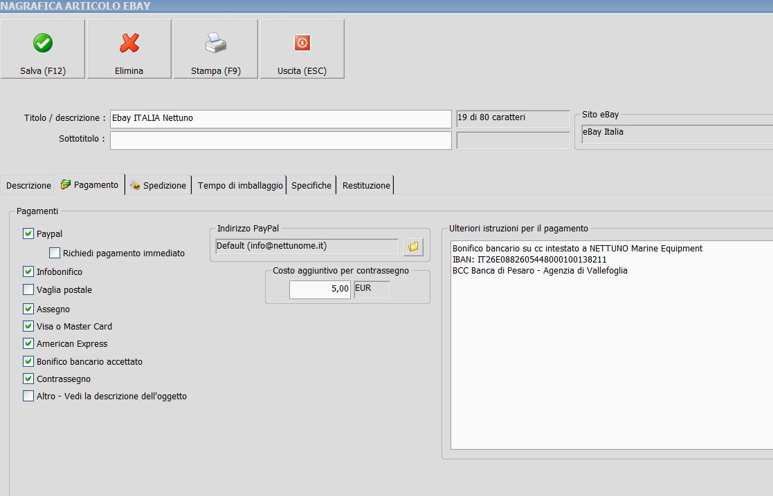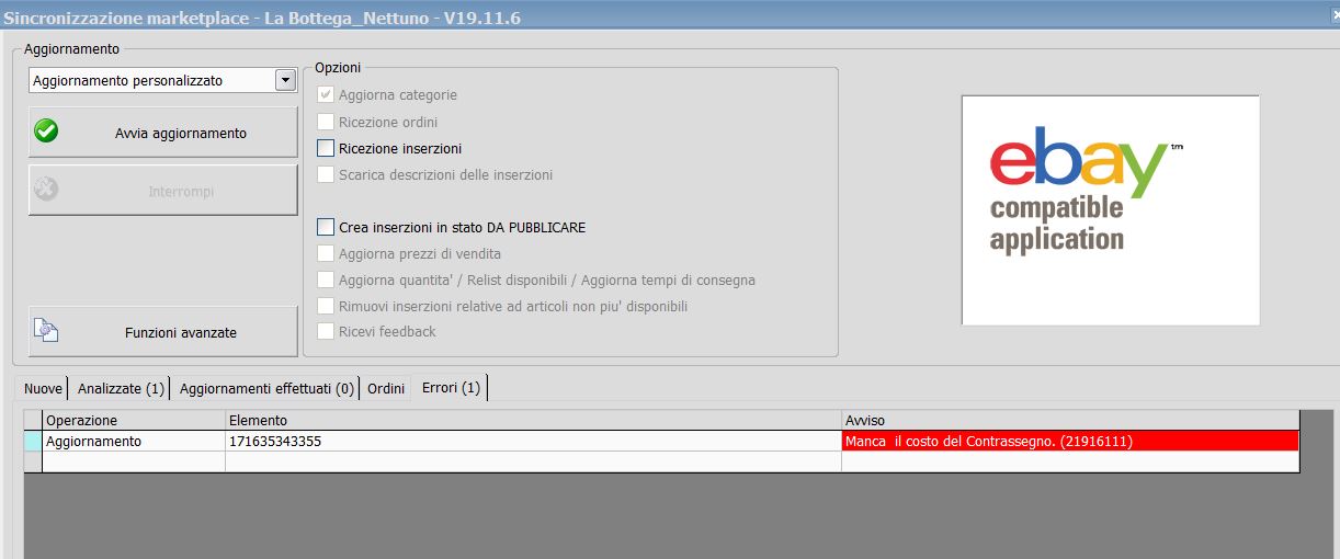 Per motivi sconosciuti gli sviluppatori eBay hanno pensato bene di inserire le spese di incasso contrassegno all'interno delle impostazioni delle spese di spedizione. Ovvero per reimpostare anche il costo del contrassegno vanno obbligatoriamente anche reimpostate le modalita' di spedizione, ma questo tramite elaborazione non e' possibile. Per questo motivo al momento non e' possibile reimpostare in massa un set di pagamenti che includa anche il contrassegno. Anche dal gestore delle inserzioni di eBay volendo reimpostare dei pagamenti riassegnando anche il contrassegno, vanno in parallelo reimpostate anche le modalita' di spedizione, e non viene consentito di procedere con un aggiornamento massivo come quello sopra