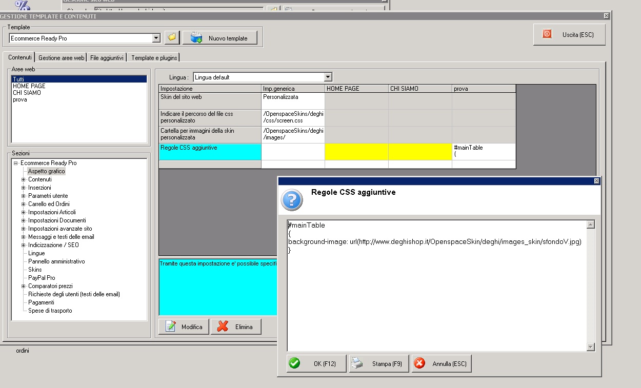 Ci chiedevamo e ci serve sapere se si possono differenziare le aree web cambiando lo sfondo, il css ecc... Noi abbiamo ad esempio prodotti per il bagno ed altri per il giardino, possiamo: - creare l'area web "bagno" con uno sfondo e il css sul blu e poi - creare l'area web "giardino" con un altro sfondo e il css sul verde ??