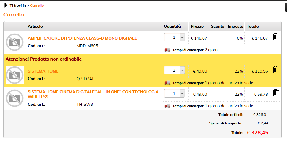 Come da immagine allegata l'avviso appare al di sopra dell'articolo non disponibile, purtroppo però quando alcuni clienti ordinano e magari si trovano l'avviso in cima non capiscono a quale articolo ci si riferisca. Spesso ci contattano per questo problema.