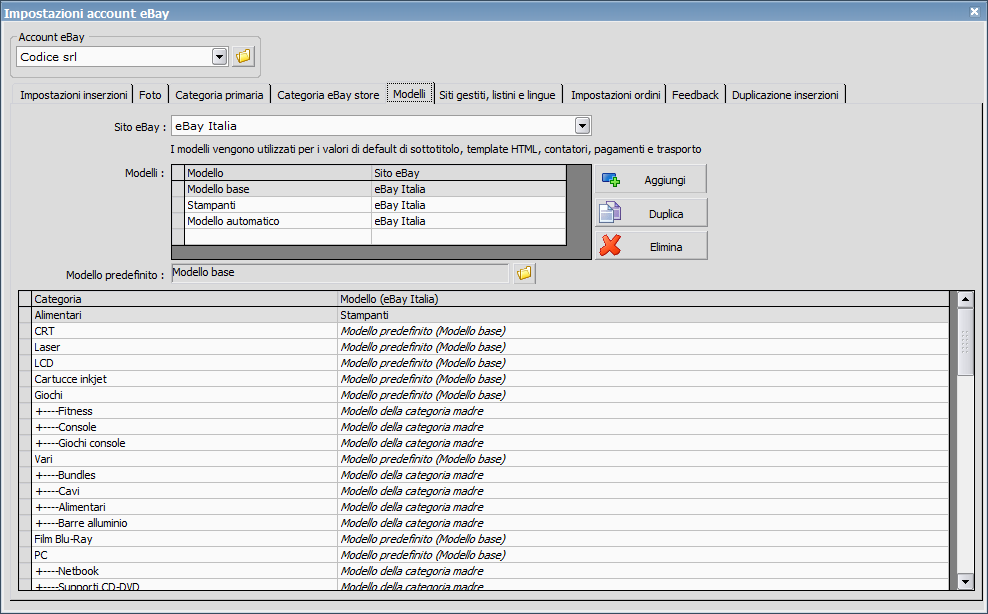 Per quanto riguarda il modello delle inserzioni questo viene determinato in base alla categoria dell'articolo. Quindi: - Sulle impostazioni dell'account eBay si puo' configurare un modello predefinito ed un modello specifico per una o piu' categorie di articoli (Categorie di Ready Pro) - Per una inserzione eBay X il modello da utilizzare e' determinato dalla categoria dell'anagrafica articolo collegata a questa inserzione