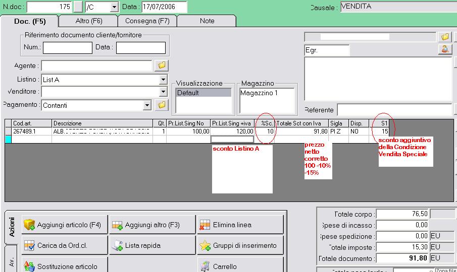 Nel Report di Visualizzazione di Default del documento Fattuta Accompagnatoria ho inserito il campo 'SCONTO DAL PREZZO DI LISTINO' che mi visualizza la % di sconto o ricarico che c'è tra il prezzo di listino e quello applicato al cliente (ho anche eliminato i campi S1, S2...). Tutto sembrava funzionare finchè non ho utilizzato una 'CONDIZIONE SPECIALE DI VENDITA'. In questo caso, pur essendo calcolato correttamente il prezzo di vendita (viene applicato l'ulteriore sconto), questo sconto aggiuntivo non viene visualizzato nella % di sconto. Es.: Se sul Listino A il codice 1 ha un prezzo di listino di 100 e su di esso viene applicato uno sconto del 10% (prezzo di vendita 90), ma su quel particolare viene concesso un ulteriore sconto del 15% (prezzo di vendita 76.50), la percentuale di sconto visualizzata dal campo 'SCONTO DAL PREZZO DI LISTINO' è solo quella del 10% e non quella corretta del 23.50%. In attesa di istruzioni porgo i miei saluti.