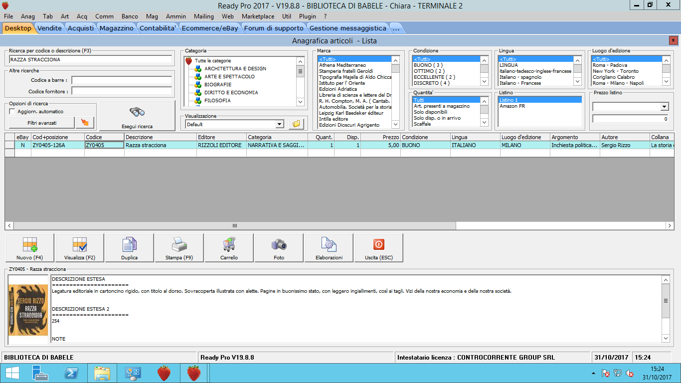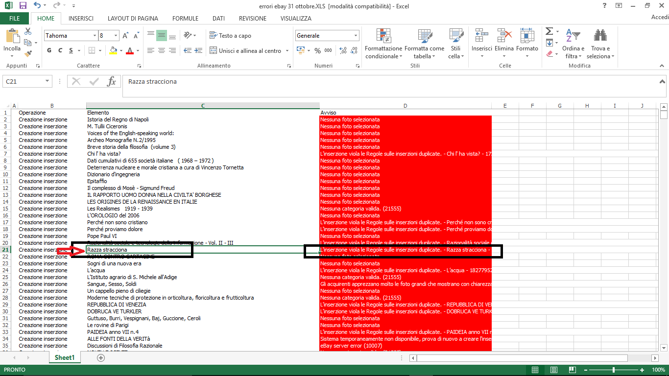 - l'inserzione viola le regole sulle inserzioni duplicate (credo si riferisca a titoli doppi che non possono apparire sul portale). Ma dopo una verifica scopro che un determinato articolo,il quale appare nella nostra schermata di errore Ready, e il quale quindi non risulta essere attivo sul portale (vedi la N accanto al codice articolo), lo trovo nel nostro catalogo Ebay. (Vedi allegati 1-2-3). Come è possibile?