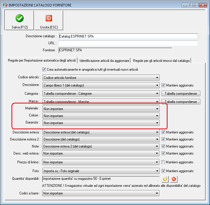 Esprinet non invia dati per quel campo quindi non ci sono valori da inserire. Puoi fare un esempio dei valori che vorresti inserire? Cosi' forse riusciamo a spiegarti meglio il motivo per cui non ha senso inserire niente sulle impostazioni del catalog