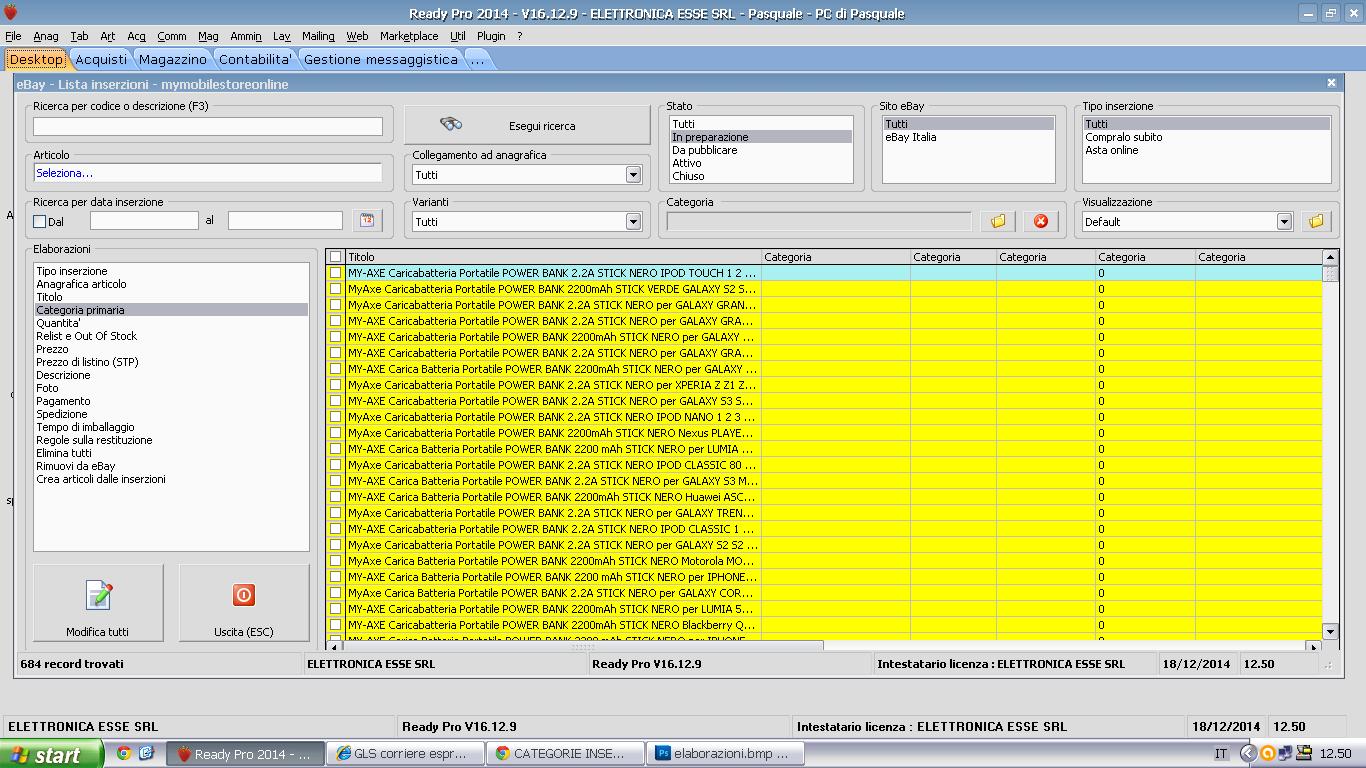 Il problema č che su queste inserzioni da duplicare non posso impostare nč la Categoria Primaria nč tantomeno la Categoria Store eBay, condizioni necessarie per poter pubblicare le inserzioni;in pratica mi ha fatto solo aggiungere l'elenco dei titoli da duplicare partendo dall'anagrafica di un'articolo (utilizzando la Funzione Aggiungi Molti) e poi mi ha ha chiesto se volevo salvarle da pubblicare o in preparazione, ma poi null'altro senza fare nessun cenno a Categorie che restano, ovviamente, campi non compilati e per questo quando vado poi a sincronizzare non me le pubblica. Naturalmente, se devo poi aggiungere queste categorie entrando in ogni singola inserzione per poi poterle mettere in vendita su eBay perderei tutta la comoditā del nuovo wizard! Aiutami, grazie!!!