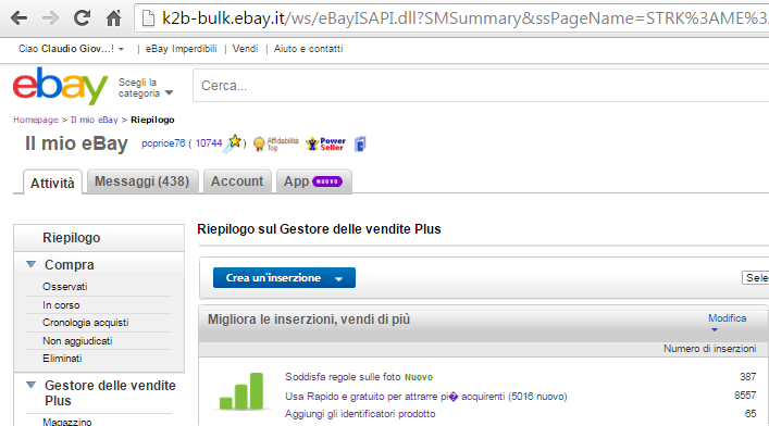 Citazione: ho provato ad agigornarne una decina e il conteggio su ebay è effettivamente sceso... Ma hai un contatore su eBay dove puoi vedere le inserzioni da aggiornare? Da dove lo vedi, dal gestore delle inserzioni? Puoi mostrarci uno screenshot?