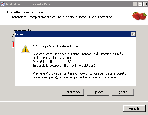 Citazione: stasera non ne vuole sapere di installarsi, Questo errore indica che il programma di installazione non riesce a sovrascrivere il fle Ready.exe e questo e' possibile solo in due casi: