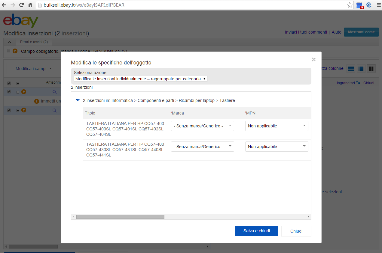 - Dall'altro lato i tecnici italiani si trovano con tool che danno risultati inconsistenti sulle percentuali di inserzioni da correggere (perche' vengono segnalate inserzioni ok per alcuni tool e non ok per altri) oltre al fatto di avere il sito eBay.it che, per chi modifica le inserzioni a mano, richiede dati che sembrano finire nelle SPECIFICHE (invece che negli IDENTIFICATORI DI PRODOTTO come dovrebbe essere)