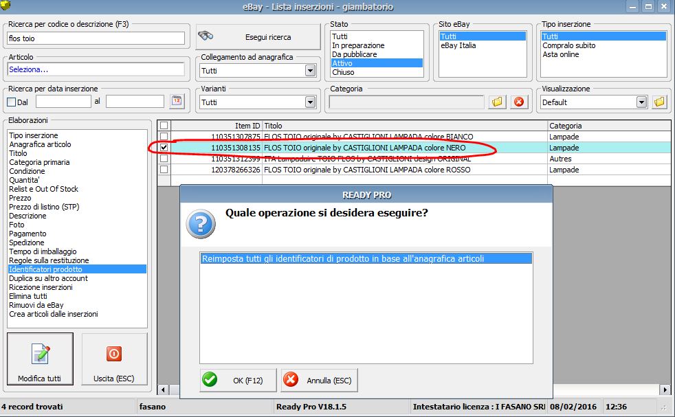 Ricordo anche che per vedere gli identificatori aggiornati deve effettuare la procedura ELABORAZIONI come indicato sul manuale, quindi si assicuri prima di tutto di aver eseguito questa operazione sull'inserzione in questione http://help.readypro.it/manual.php/it/2683/reimpostare-gli-identificatori-di-prodotto-per-inserzioni-ebay-preesistenti