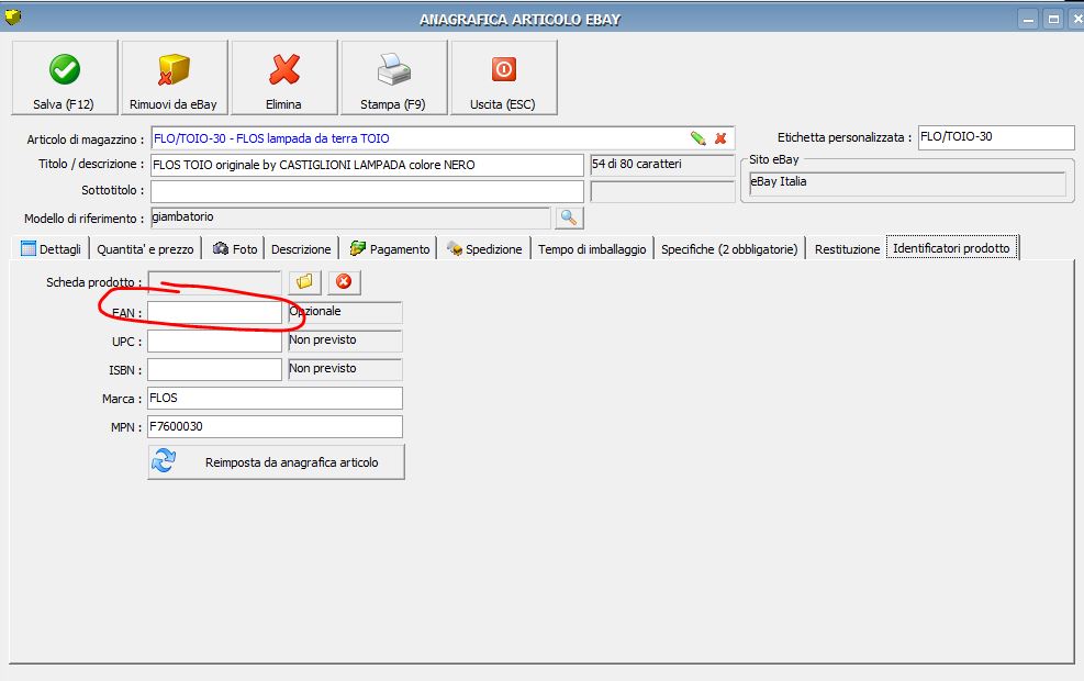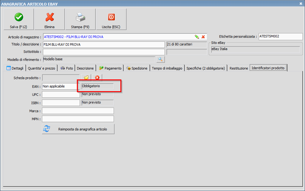 E' normale che i prodotti creati da zero che non hanno identificatori se non si clicca sul tasto reimposta da anagrafia articolo ebay chiede dopo di aggiornare l'inserzione con il codice ean ?