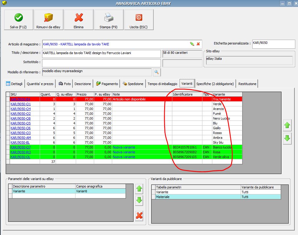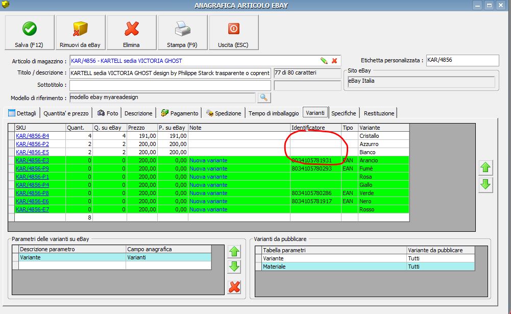 il codice ean è impostato su tutte le varianti nell'anagrafica. Come si imposta su eBay di inviare i codici EAN?
