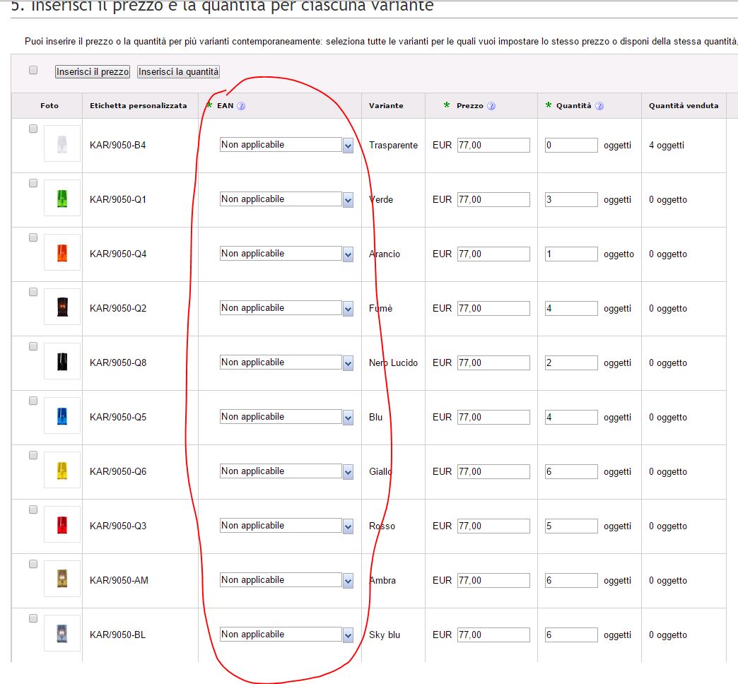 Fabio riapro il thread perché ebay mi ha comunicato telefonicamente che è possibile inserire i codici EAN nelle inserzioni con varianti come mostrato in allegato.