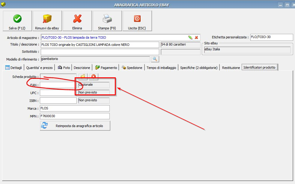 Citazione: E' normale che i prodotti creati da zero che non hanno identificatori se non si clicca sul tasto reimposta da anagrafia articolo ebay chiede dopo di aggiornare l'inserzione con il codice ean ?
