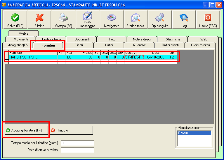 Per poter associare uno o più fornitori all'anagrafica dell'articolo devi andare nel tab FORNITORI dentro l'anagrafica articolo. Qui puoi assegnare i fornitori, dare a loro una priorità di preferenza, dire qual'e' il prezzo di acquisto e le eventuali classi di sconto, inserire una nota, il codice utilizzato dal tuo fornitore (che puoi stampare quando emetti un ordine) [color=red:3b1e273d37]IMMAGINE 1