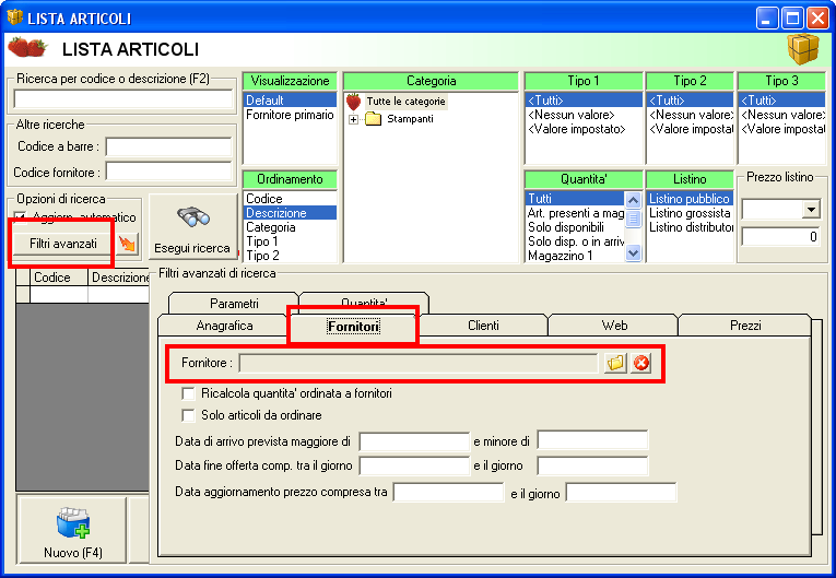 Per poter invece sapere quali articoli ti fornisce un determinato fornitore puoi utlizzare il tab ARTICOLI oppure fare un ricerca direttamente dalla lista articoli usando i filtri avanzati. [color=red:3b1e273d37]IMMAGINE 2