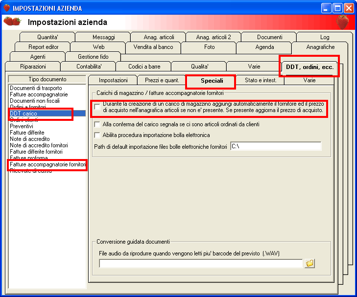 Puoi anche impostare un automatismo per fare in modo che al momento di un carico di magazzino READY assegni in automatico il determinato articolo (presente nel carico) al fornitore intestatario del documento di carico. Per fare questo devi accedere al menu' UTIL-->IMPOSTAZIONI AZIENDA--> DDT, ORDINI ECC. --> selezioni il documento DDT DI CARICO ---> selezioni il sotto tab SPECIALI---> spunti il check "DURANTE LA CREAZIONE DI UN CARICO DI MAGAZZINO AGGIUNGI AUTOMATICAMENTE IL FORNITORE ED IL PREZZO DI ACQUISTO NELL'ANAGRAFICA ARTICOLI SE NON E' PRESENTE. SE PRESENTE AGGIORNA IL PREZZO DI ACQUISTO [color=red:3b1e273d37]IMMAGINE 3