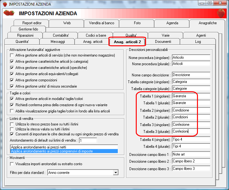 Su UTIL / IMPOSTAZIONI AZIENDA / ANAG. ARTICOLI 2.