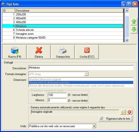 ad esempio per la miniatura ho impostato come file di origine la foto "Originale" e come dimensioni massime il limite di 100 sulla larghezza. Però ho visto che vi sono delle foto 100x100 e altre 100x300.. quindi me le visualizza 100x300.. io invece vorrei che fossero tutte uguali, cioè che le dimensioni non eccedano il 100x100 e che non vengano deformate. stesso discorso per le immagini "Scheda articolo"