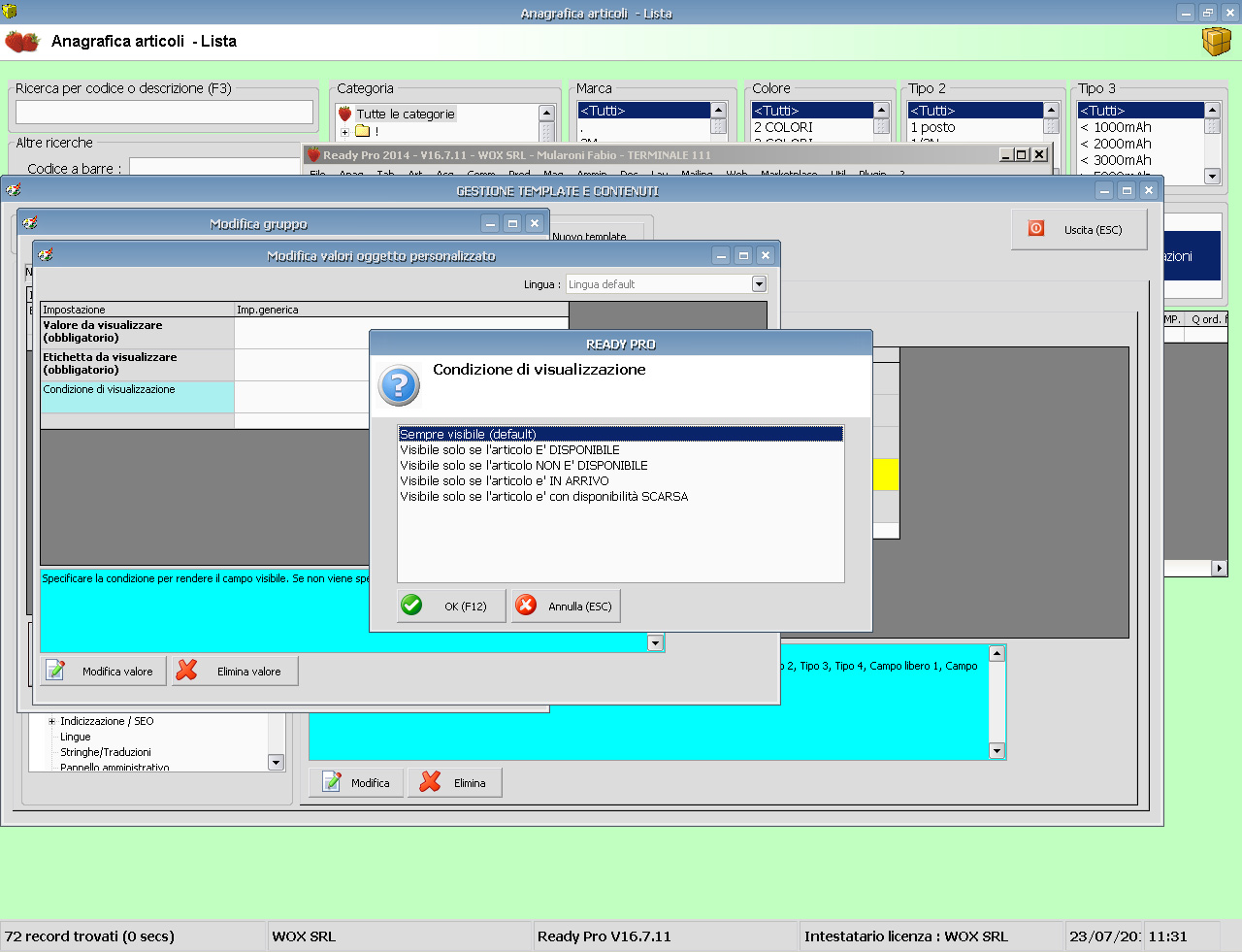 Condizioni di visualizzazione Elenco Campi Personalizzati Articoli