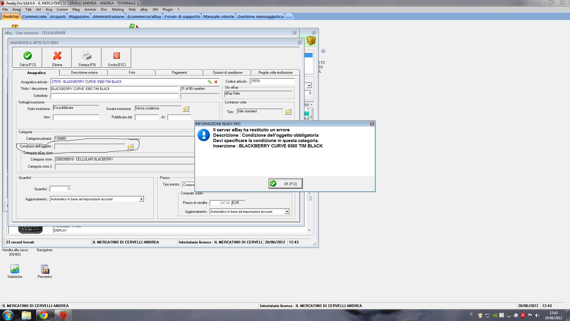 Giorno , sono 2 giorni che trovo difficoltà nella pubblicazione delle inserzioni su e-bay , da quello che ho potuto capire sulla descrizione del prodotto mancano le condizioni dell'oggetto , premettendo che ho sempre pubblicato senza problemi , non capisco questa anomalia , carico i prodotti tramite catalog ready questo è per farvi capire , il campo della condizione dell'oggetto risulta non cliccabile anche volendo , ma non lo mai fatto in quanto la dicitura che usciva prima era NUOVO , comunque sperando che mi sono fatto capire ihihi non vado forte nelle descrizioni allego foto , potreste gentilmente aiutarmi ed indicarmi il da farsi . ANDREA