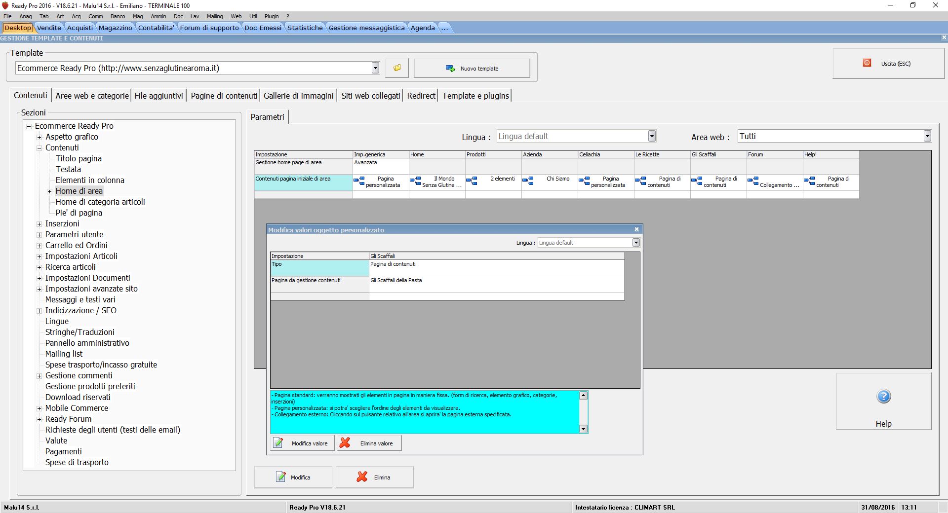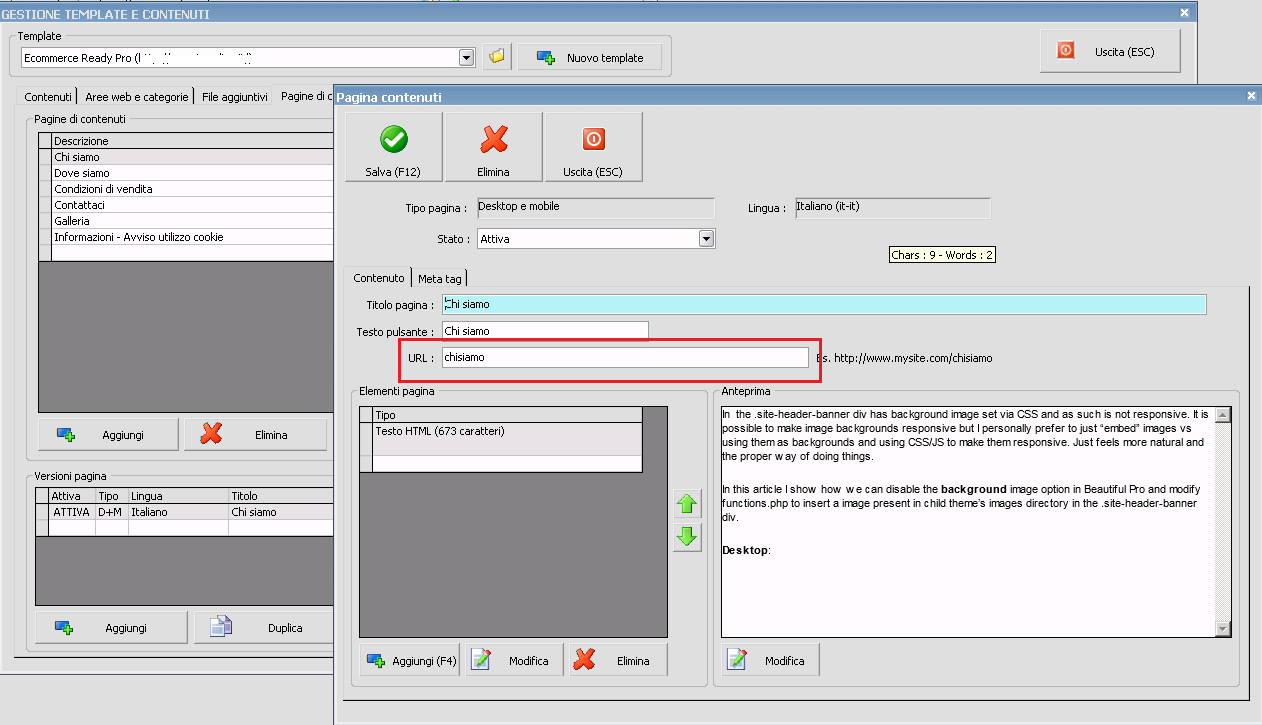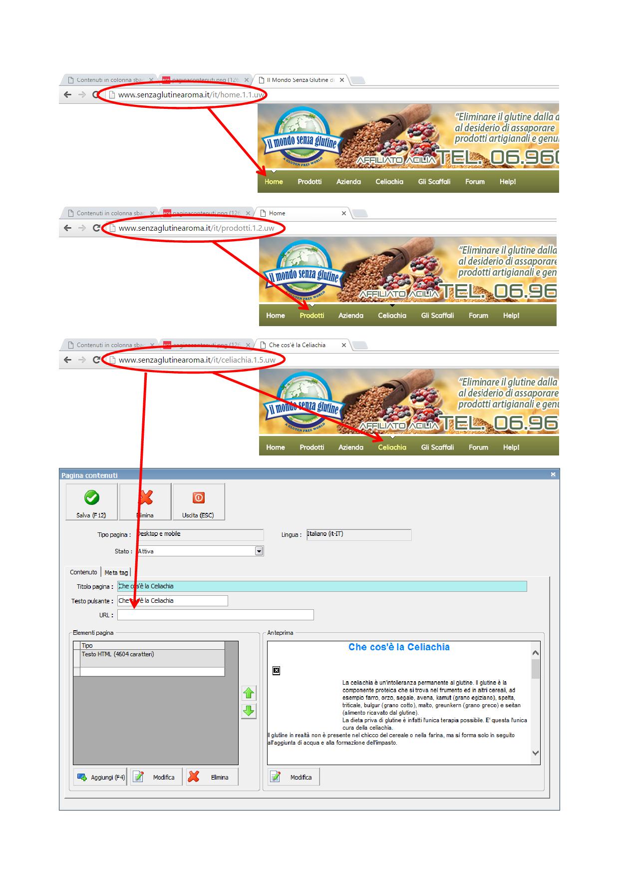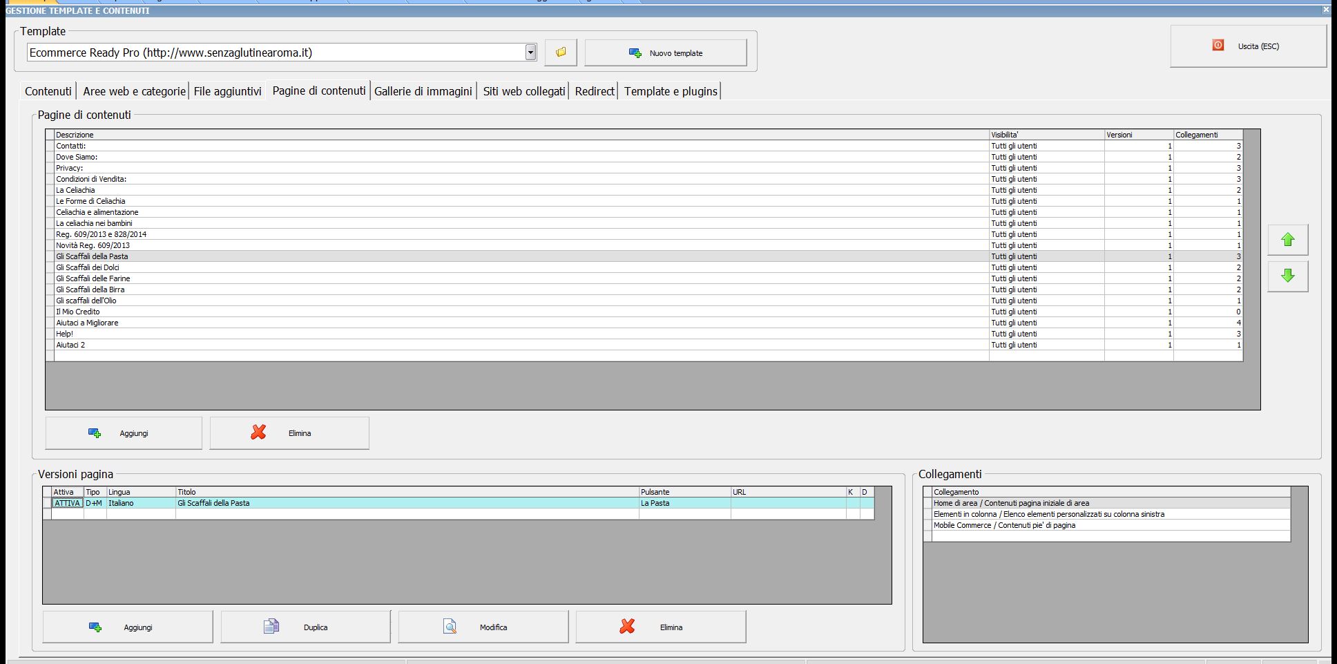 non credo sia questo il problema, in quanto non ho mai compilato quel campo, e ready lo riconosce come puoi vedere dal file allegato "screen-pagine.jpg", non solo lo identifica anche se vuoto, ma lo numera in base alla sequenza delle pagine create all'interno del gestionale, comprese quelle non pubblicate. Se si clicca sul pulsante della pagina "Gli Scaffali" appare nella barra degli indirizzi quanto segue "http://www.senzaglutinearoma.it/default.asp?cmd=webPage&cmdID=11" mentre se clicchi su qualsiasi altra pagina nella barra degli indirizzi vedi la corretta definizione, come puoi constatare dal file allegato"screen-pagine.jpg", per accedere alla pagina quasi corretta, in quanto SEMPRE sulla colonna di DX appare un albero non indicato in Contenuti\elementi in colonna\ ecc.. vedi allegato"elementi in colonna gli scaffali.jpg" devi digitare manualmente nella barra degli indirizzi il seguente link: "http://www.senzaglutinearoma.it/it/gliscaffali.1.6.uw". allegato"pagina gli scaffali.jpg".