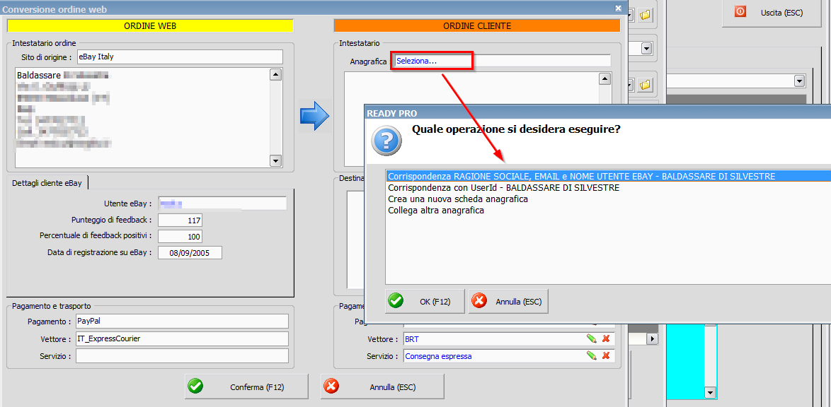 Citazione: 1) come collego l'anagrafica all'ordine ebay per poterlo convertire in ordine Ready? Nel momento in cui fate la conversione dell'ordine eBay, la finestra di conversione consente di selezionare l'intestatario corrispondente da usare sul documento convertito