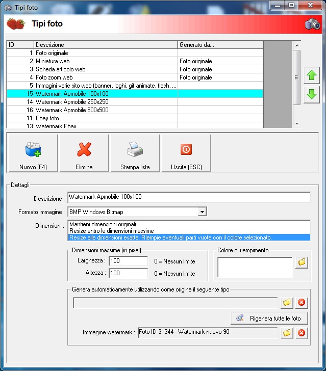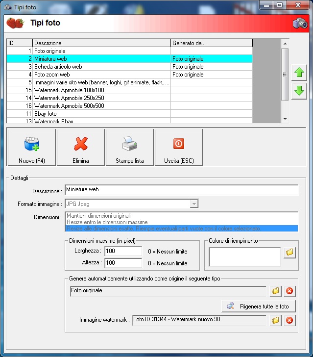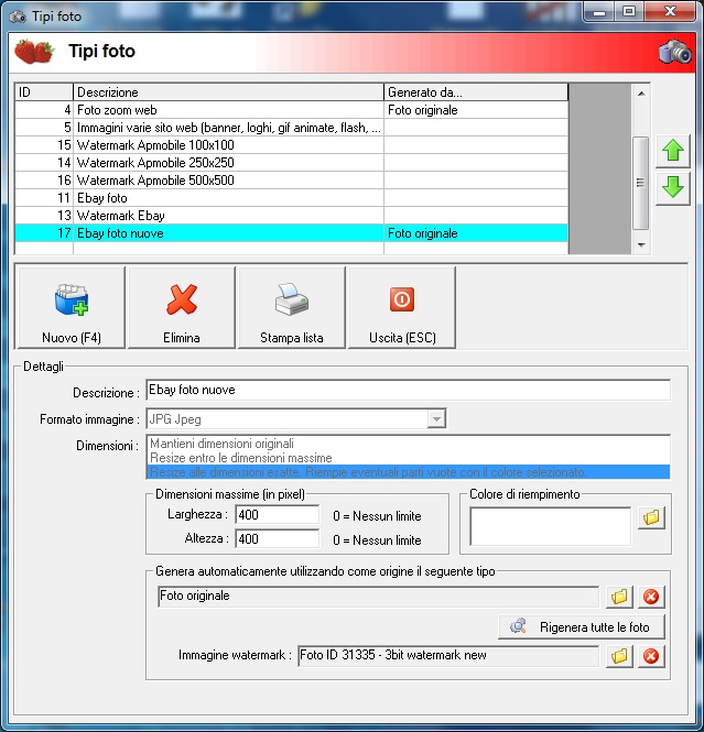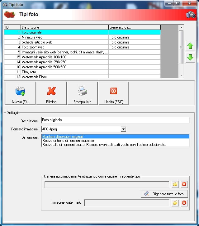 Citazione: Anche questo è normale: le foto sono tutte generate dalla FOTO ORIGINALE. Quindi anche non cliccando su "Rigenera tutte le foto", ma semplicemente sulla cartellina gialla "Rigenera automaticamente utilizzando come origine il seguente tipo"? Quindi anche se quella di Ebay è collegata alla foto originale mi rigenera tutto?! perché in questo caso allora è tutto chiaro, quindi tutto quello che viene generato in automatico da una foto master viene rigenerata ogni qualvolta si vuole rigenerare un tipo?