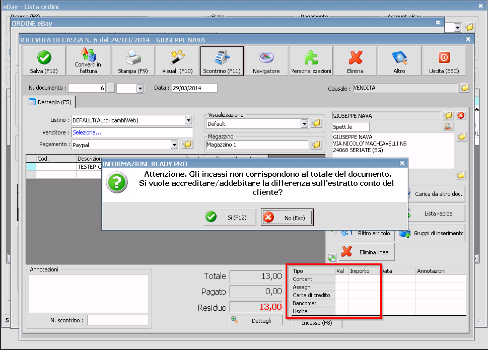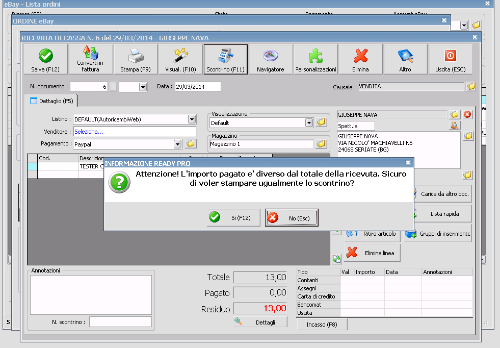3) Se volete/dovete stampare lo scontrino, cosa dovrebbe essere battuto in caso di incasso con PayPal? Perche' un incasso come "contanti" non e' sarebbe chiaramente corretto, e sui registratori di cassa non esiste un pagamento "PayPal". Su questo magari puo' esservi di aiuto il vostro commercialista, cioe' per sapere come dovreste battere lo scontrino per questo tipo di vendite (sempre che dobbiate battere uno scontrino chiaramente)