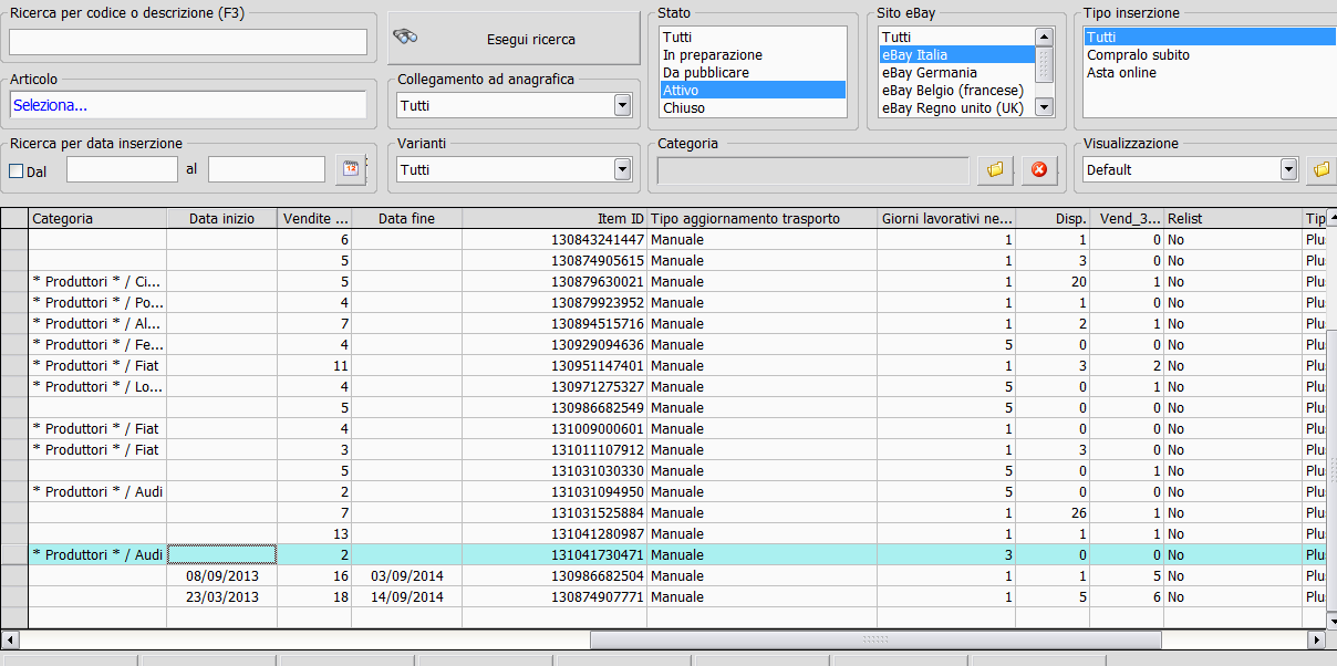 Dal modulo "Marketplace" - Ebay - gestione inserzioni se cerco le inserzioni attive, non visualizzo pių il campo data inizio inserzione e data fine (questo mi sembra avvenga da quando ho inserito l'opzione out of stock); se clicco nell'inserzione e chiudo la finestra questi campi, che prima erano vuoti, vengono mostrati correttamente; utilizzo queste date per chiudere periodicamente le inserzioni pių vecchie che non hanno avuto vendite per poi relistarle nuove; potete cortesemente verificare? grazie