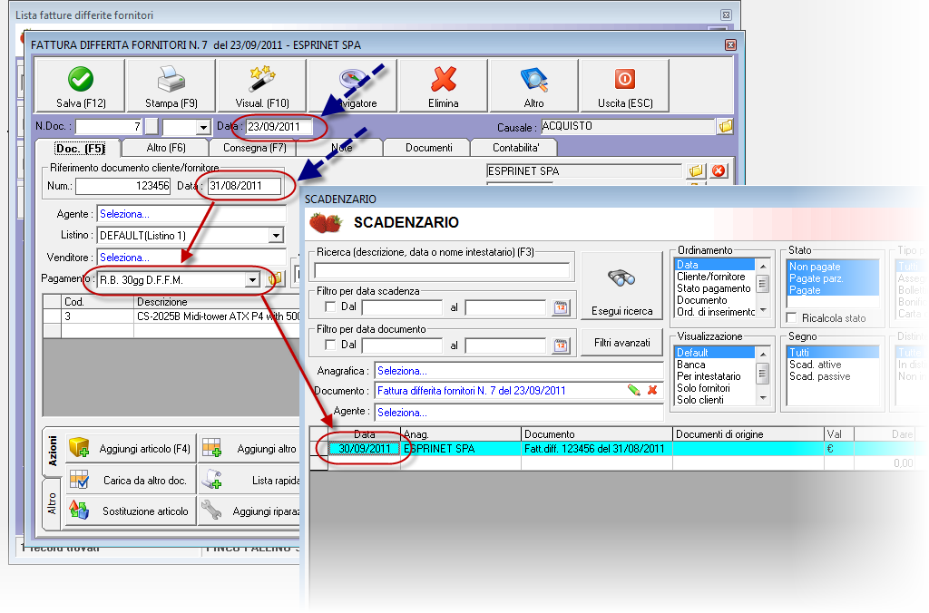 vorrei chiedere come mai nelle fatture differite fornitori, la data presa come riferimento per calcolare le scadenze dei pagamenti è la data di registrazione del documento (che si mette automaticamente) e non quella del "riferimento documento fornitore". Non sarebbe più logico che fosse quest'ultima? I miei fornitori mi fanno praticamente tutti una fattura a fine mese, ma me la possono inviare anche 10/20 giorni dopo la data indicata in fattura. In questo caso sono obbligata a cambiare la data di registrazione e mettere la stessa data della fattura. Questo non sarebbe necessario se il programma prendesse direttamente in conto la data della del documento (fattura) del fornitore.