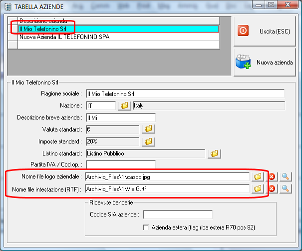 Se nella precedente azienda hai inserito l'intestazione sulle stampe usando un file RTF puoi collegarne un'altro tramite l'apposita procedura TAB / AZIENDE: