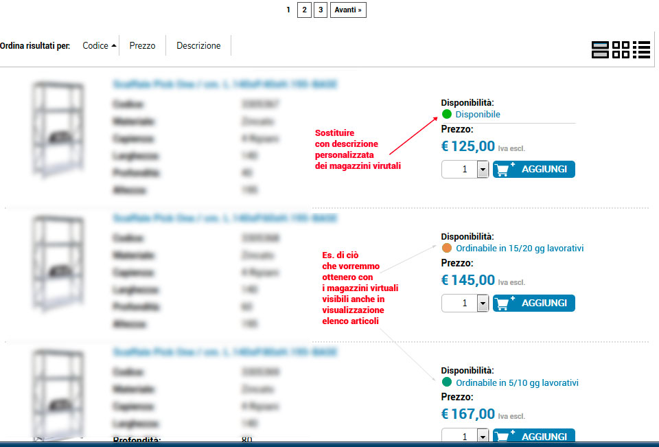 Disponibile / Ordinabile in visualizzazione elenco articoli ma con descrizione attribuita ai magazzi virtuali.