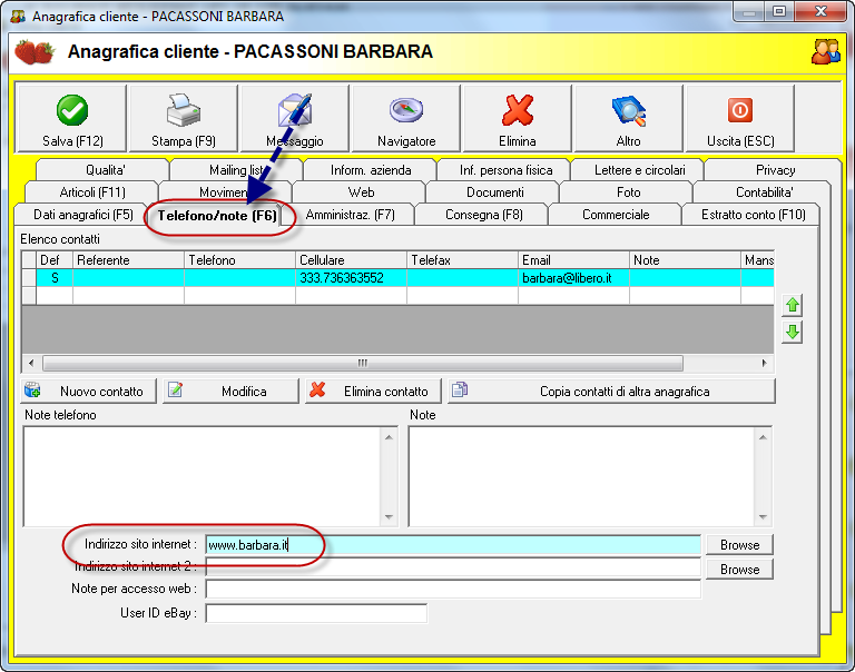 Dal menù util impostazione visualizzazione/stampe, selezionando Contatti-Lista è possibile inserire la voce sito web. Quella voce si riferisce al sito web dove il cliente si è registrato (ovvero il mio) o un riferimento del suo sito web, praticamente se è in possesso di un sito web? Nel caso fosse la seconda ipotesi mi servirebbe inserire un campo nella registrazione utente in cui possa scrivere il suo sito web e che poi venga riportato all'interno dei contatti e successivamente delle informazioni del cliente. Oppure e' possibile farlo solo con un campo Note nel form di registrazione.