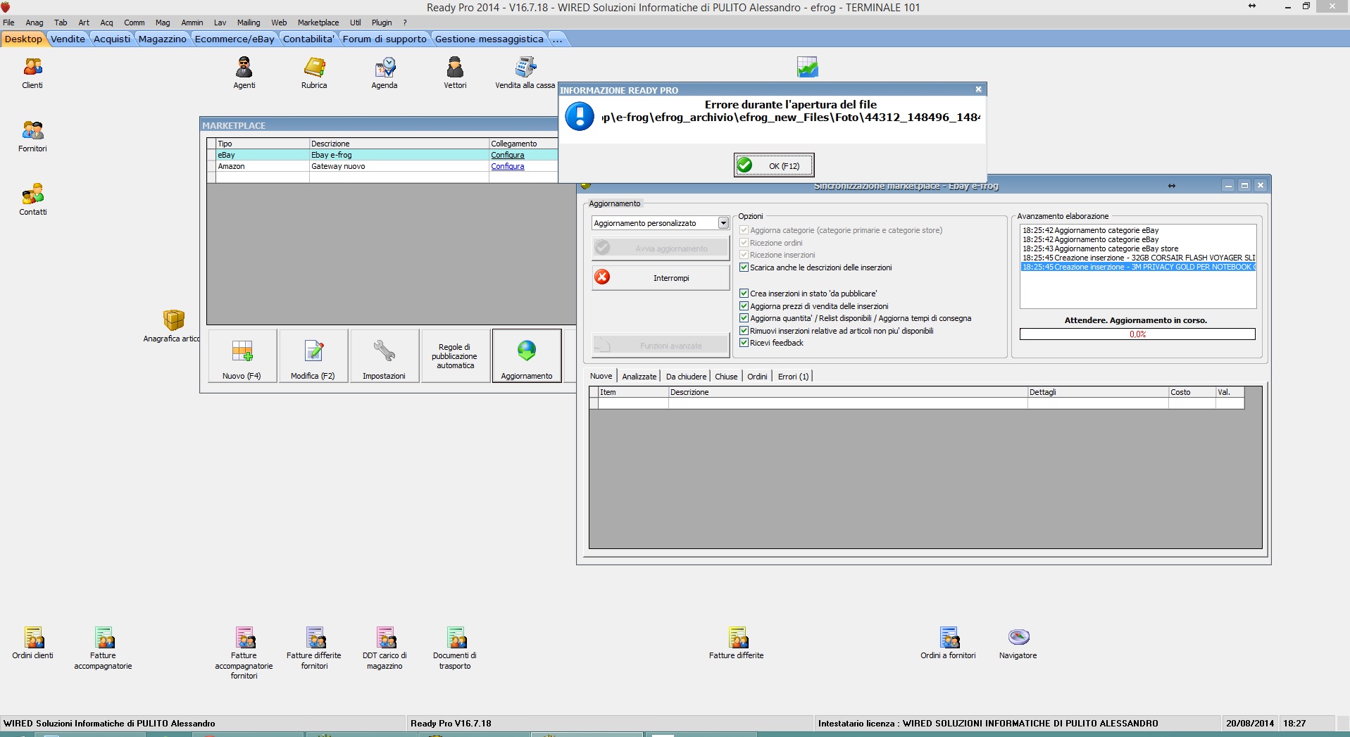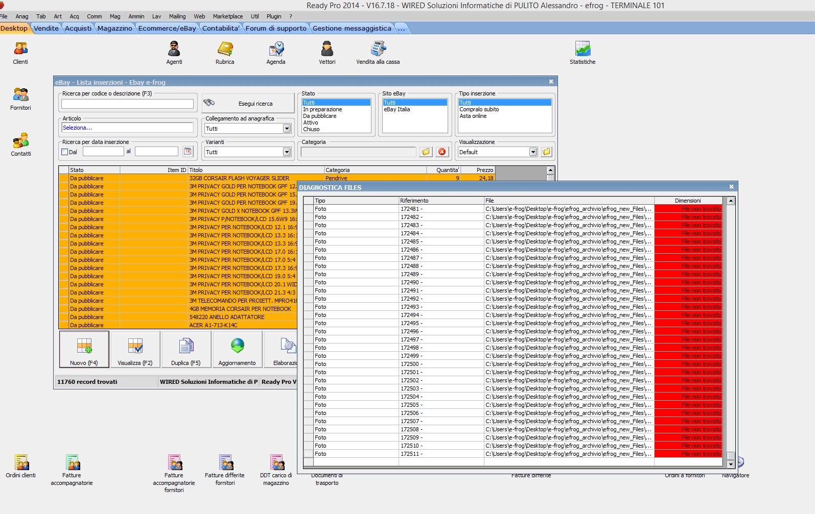 Vedo tra l'altro che l'archivio e' inserito in una cartella sul desktop di un utente specifico, e questa non e' una posizione consigliabile in particolare per l'utilizzo condiviso tra piu' utenti (non so se sia il vostro caso). Di default infatti gli archivi vengono creati in una cartella C:\Ready\ReadyPro\Archivi ed a meno di esigenze particolari l'ideale sarebbe che rimanessero in tale posizione