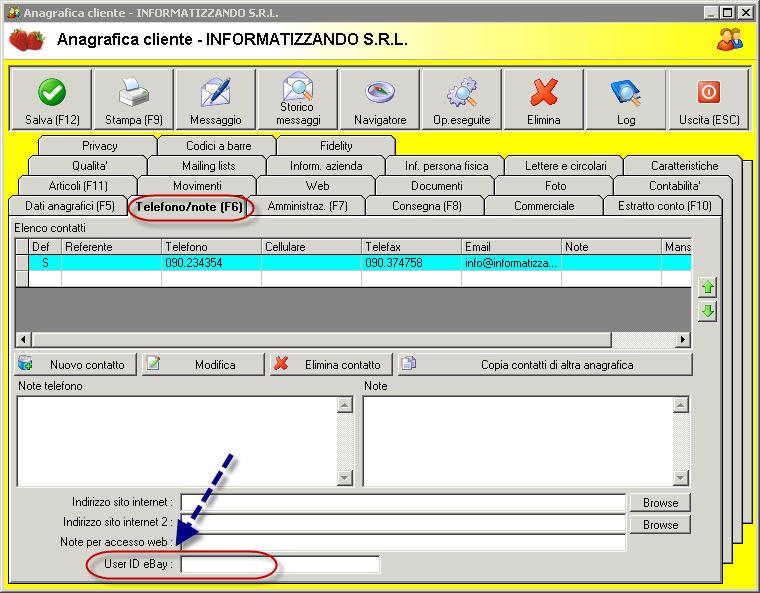 Citazione: Se fosse possibile sarebbe utile che quando viene utilizzato un cliente che già è presente in archivio, magari perché ha comprato sul sito, si associasse automaticamente l'id ebay, operazione che al momento faccio manualmente. Forse la cosa migliore e' che eliminiamo completamente il controllo legato ad eventuali anagrafiche con ragione sociale uguale. Forse meglio lasciare solo un controllo sullo userid ebay per verificare eventuali anagrafiche esistenti. Ed eventualmente sul solo indirizzo email