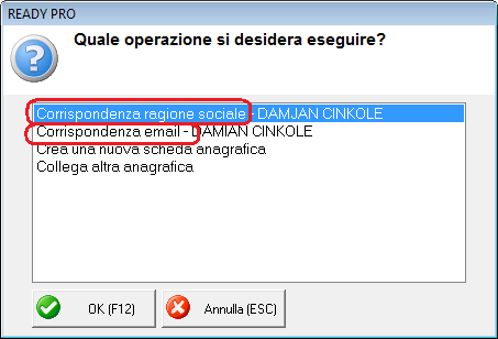 Citazione: Gli indirizzi mail sono diversi dei due clienti Si immagino. Infatti ti sara' sicuramente comparsa solo l'opzione "Corrispondenza ragione sociale". Il mio era solo un esempio per mostrarti che se esistono piu' corrispondenze in anagrafica vengono mostrate, con anche specificato il campo su cui e' stato trovata la corrispondenza.