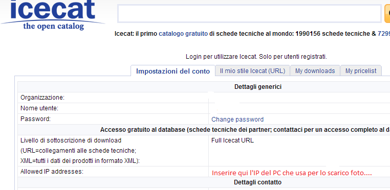 Salve, .....mi permetto di segnalare (qualora non l'abbiate già fatto) che da un po di tempo ICECAT consente lo scaricamento delle foto con contratto Full ICECAT se identifica l'IP di provenienza del PC titolare del contratto Full ICECAT (possono essere inseriti anche più indirizzi IP separati da uno spazio); per fare ciò basta loggarsi nella propria area ICECAT e come da figura allegata procedere alla modifica (qualche minuto dopo della modifica vi arriverà al vs. indirizzo e-mail una notifica da ICECAT con oggetto "Cambio della proprietà dell'utente Icecat " che vi notifica, appunto, che avete effettuato tale modifica...)