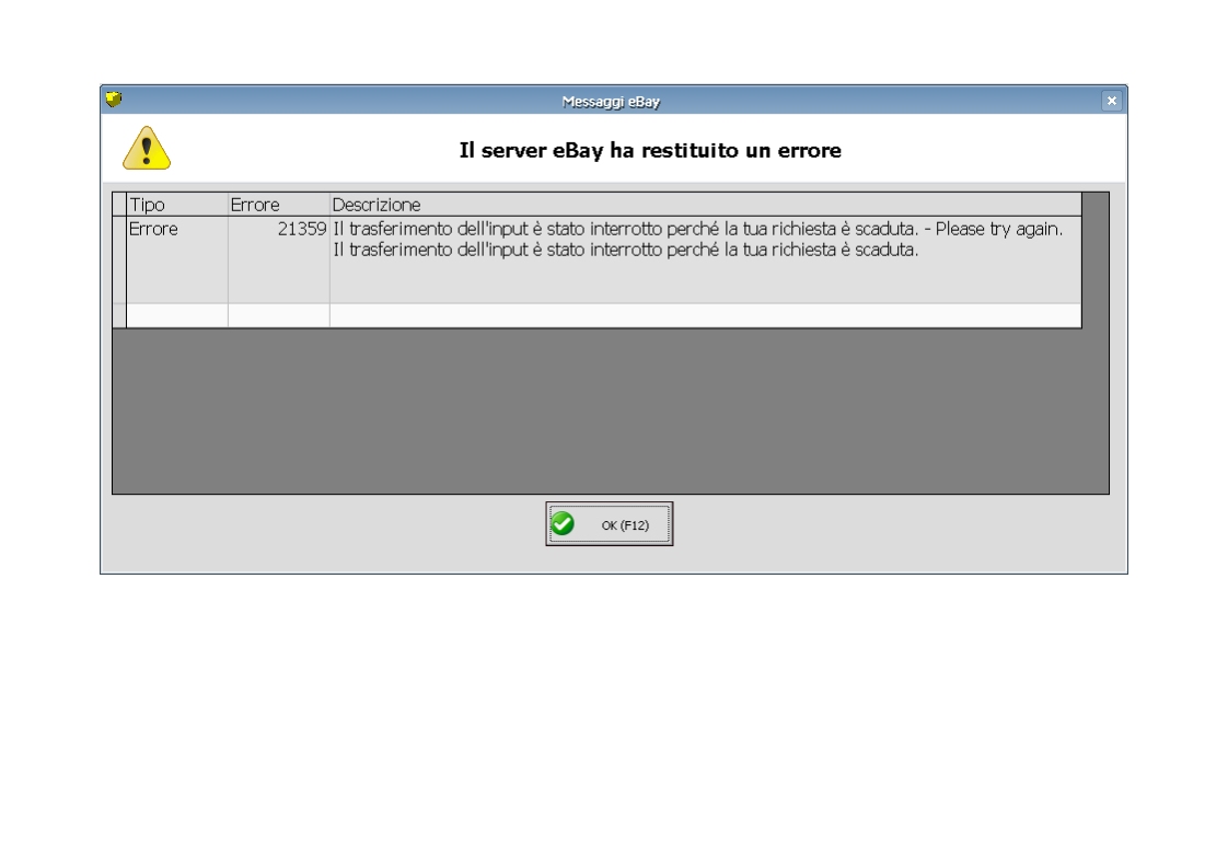 ho un problema serio con l'aggiornamento ebay. se provo a ripubblicare un'inserzione chiusa (perché ho venduto l'oggetto e lo voglio ripubblicare, quindi stessa identica inserzione, stessa foto ...) fa 10 tentativi di connessione e alla fine dopo diversi errori, mi pubblica l'inserzione senza foto. appena faccio l'aggiornamento completo di ebay (ho decine di inserzioni da pubblicare) mi dà immediatamente l'errore che vi allego.... e dopo decine e decine di volte che mi esce questo errore...le inserzioni non vengono pubblicate) mi aiutate? da giorni ho questo problema
