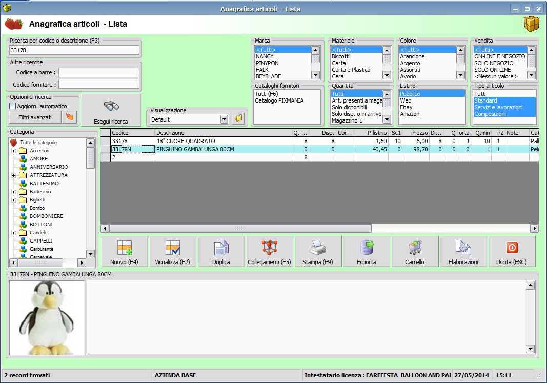 Citazione: Rimane il fatto che una scheda di un art. diverso (come n. 33178N, descrizione e natura) è stato associato ad un art. presente sul magazzino ma di natura completamente diversa (si tratta di un palloncino). Hai sbagliato a scrivere 33178N con una N in piu', e parli sempre dell'articolo sopra, oppure parliamo di un altro?