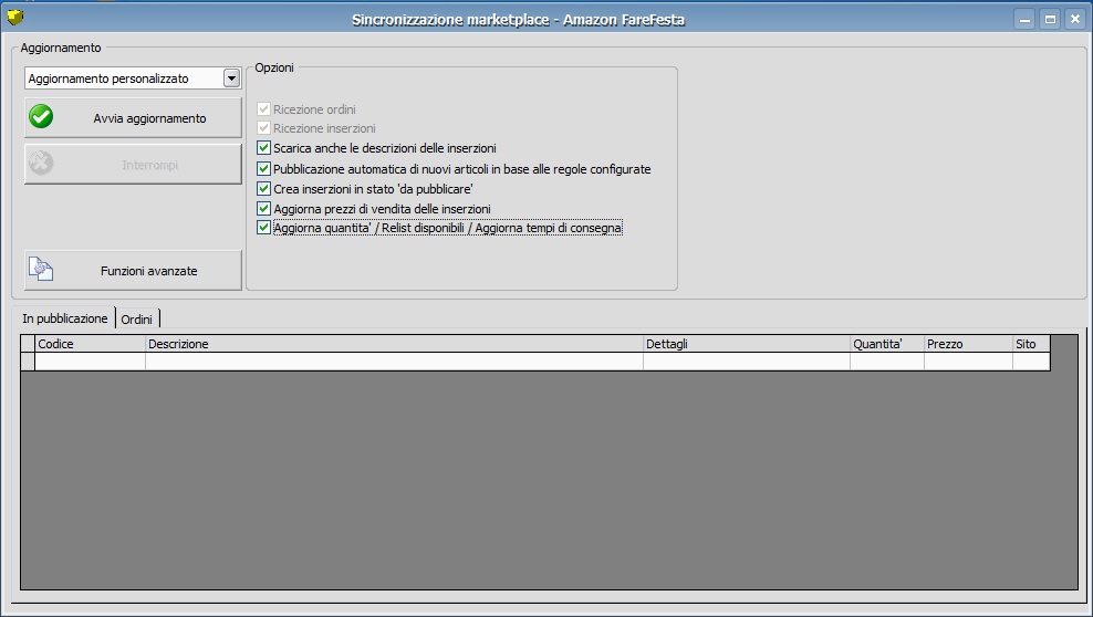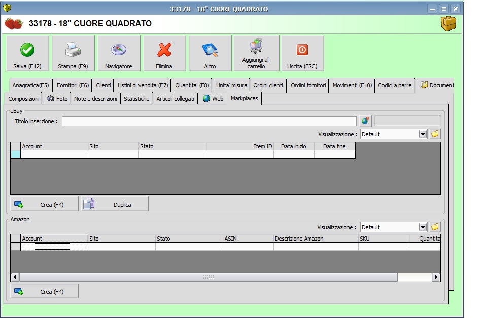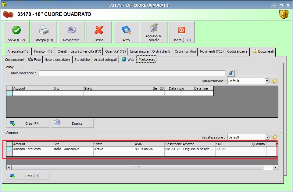 Certamente c'è una associazione non corretta. Con la nuova procedura di Ready è cmq stata creata (intendo con il 3317 una scheda sul markplaces dell'art. che prima, ovviamente non c'era. Tieni presente che prima che mi accorgessi dell'errore su Amazon erano disponibili 8pz a EUR 4,00. Solo aggiornando con la vecchia procedura si è riallineato la giusta q.tà cioè "0". Perché con la nuova procedura, invece, mi carica 8pz?