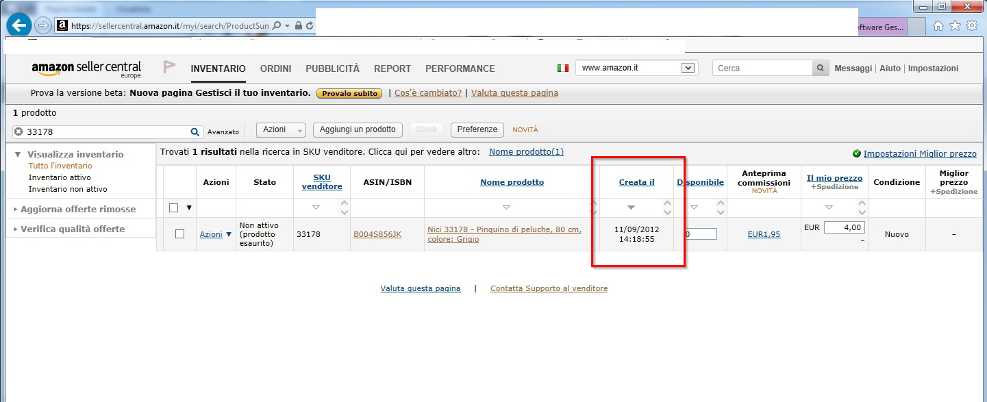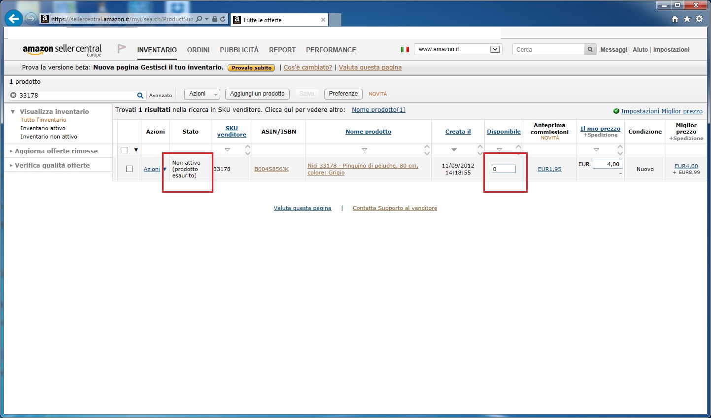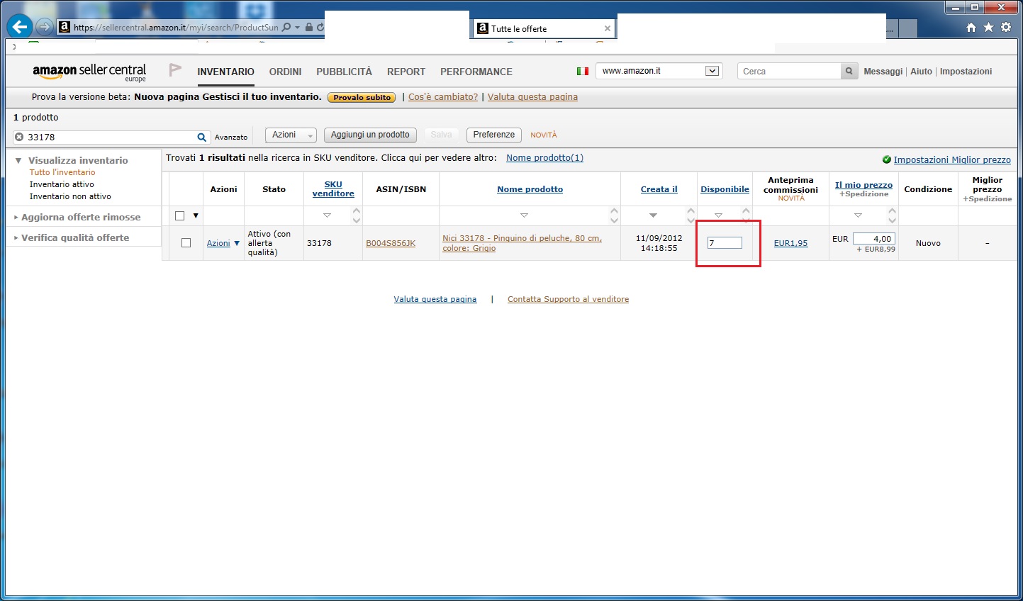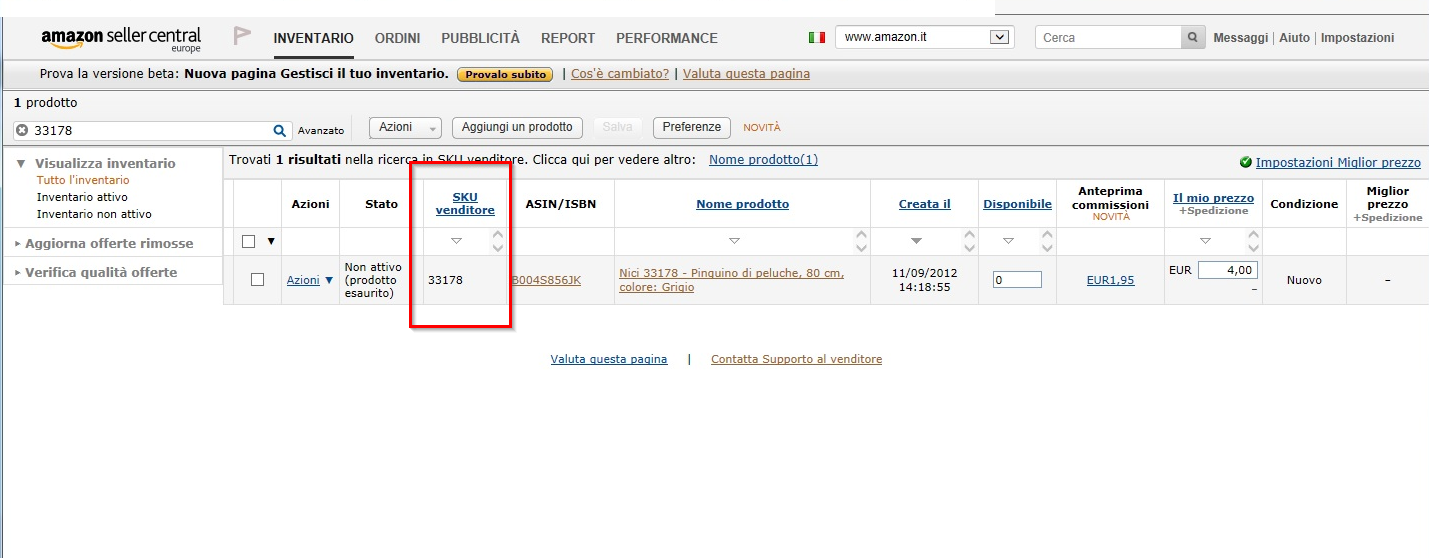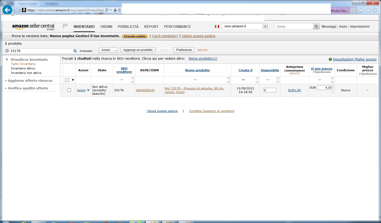 Allora su Amazon l'articolo come dicevo non e' creato correttamente. E' stato creato nel 2012 con SKU 33178 su Amazon, ma il tuo SKU 33178 corrisponde al "cuore quadrato 18'" e non al "pinguino 80cm" che ha invece SKU 33178N