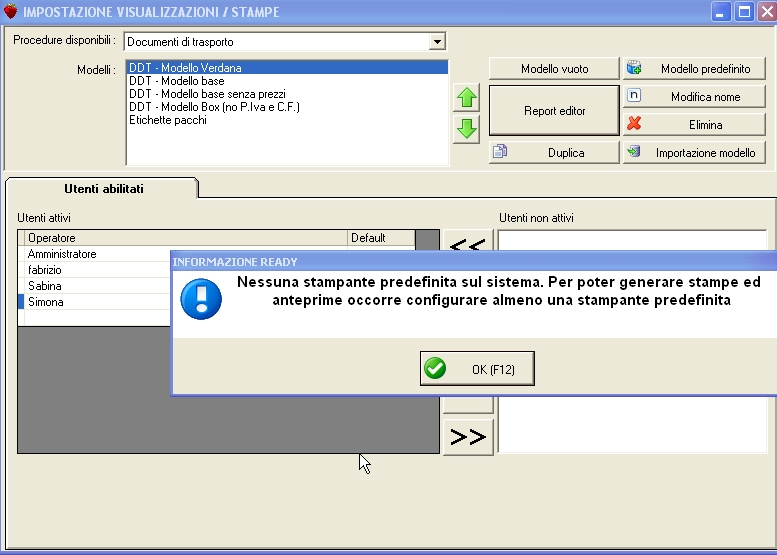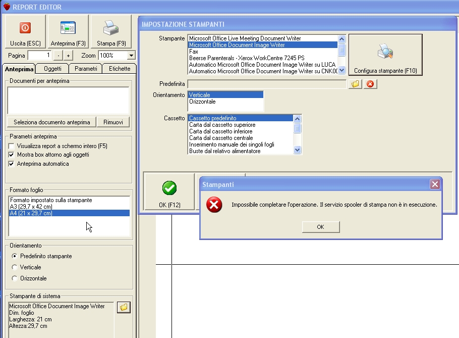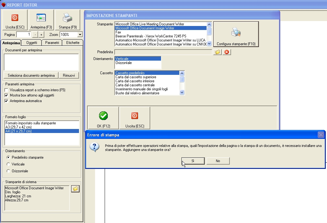 Salve, sto provando Ready,ed è installato sul mio pc da un pò. Stavo cercando modificare un report per DDT (cosa che 2 settimane fa ha funzionato senza alcun problema). Il sistema mi ritorna sempre il messaggio di errore relativo alla stampante non installata, ma io ne ho anche piu di una installata (ed è la stessa situazione presente da tempo, anche quando questa attività ha funzionato). Ho verificato che il servizio si spool sia attivo. Le uniche differenze sono le seguenti: Ho installato .NET 2.0 e se c'è una dead line per il periodo di prova potrei averla superata. attendo un vostro gentile riscontro, Saluti