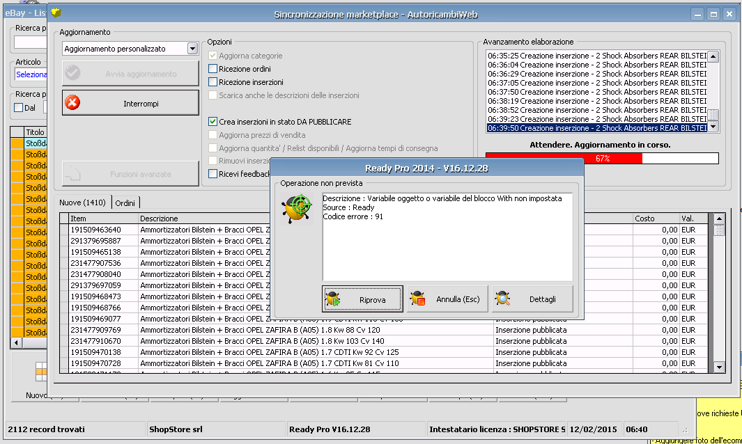 Errore beccato: Solito errore come da screen, su riprova non accadeva nulla, abbiamo annullato ed abbiamo controllato l'ultima inserzione su ebay creata. Risultato: Ready ha creato l'inserzione ma non l'ha collegata al gestionale Oggetto ebay 191520472903 Difatti se cerchiamo l'inserzione in oggetto dentro Ready non la trova, mentre quella che ha screato 20 secondi prima esiste