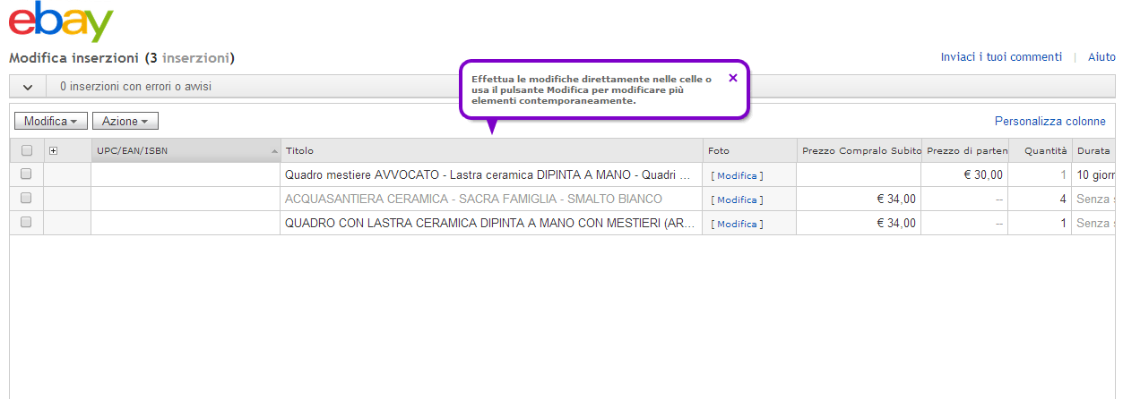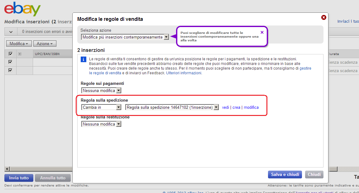 Scusate voi per la mancanza di chiarezza; volevo capire, su ebay, dove vengono gestite le regole di vendita che vedo nella vostra immagine; ho contattato l'assistenza ebay e mi hanno risposto che le regole di vendita sono previste per pochi venditori in quanto ancora in fase di sviluppo, ed io non posso averle. A questo punto ho grossi problemi per gestire le esclusioni di alcuni paesi in modo molto agevole per alcuni gruppi di inserzioni (so che potrei impostare le esclusioni su ebay a livello di account, ma questo non fà al mio caso) ancora una volta spero nei vostri aggiornamenti futuri grazie
