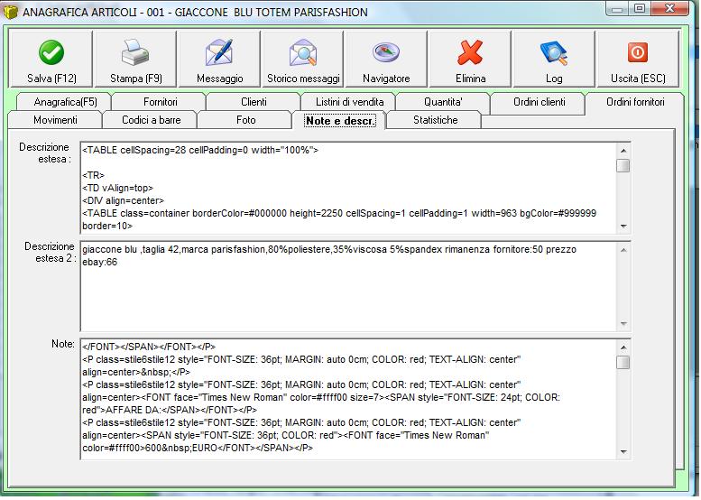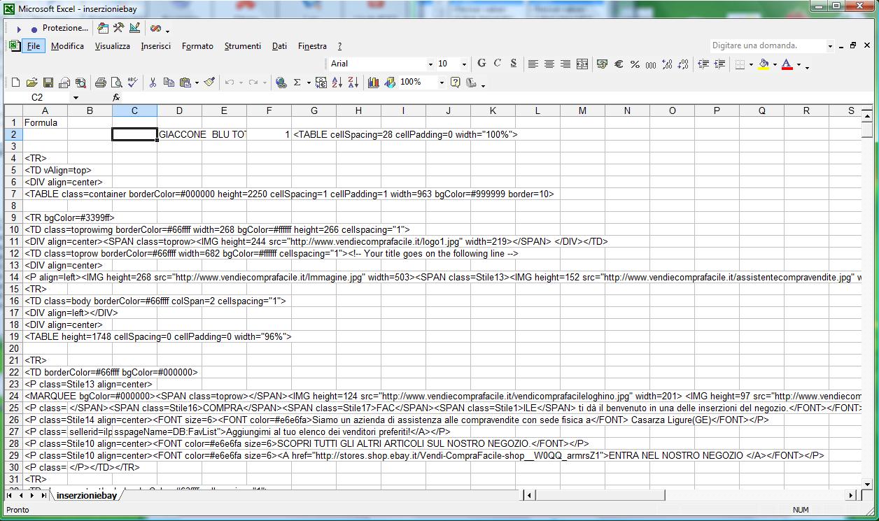 ecco come deciso con massimo del commerciale...che allego la tabella che fornisce turbo lister in csv. i campi obbligatori di ebay turbo lister sono 5(categoria,titolo,descrizione,prezzo di partenza) i campi necessari sono: -titolo(su ready descrizione) -categoria(su ready categoria) ps: servono le categorie di ebay che hanno tutte un codice di riferimento su turbo lister..ma che io non ho ancora trovato una lista. -sotto categoria(cioe la categoria del negozio ebay)(da aggiungere semplicemente alle categorie di ready) -foto -descrizione in mezzo a dell'html(su ready descrizione estesa) -etichetta(su ready codice articolo) -prezzo (su ready prezzo di listino ufficiale) -quantità -spedizione su ready(su ready tipo 2)