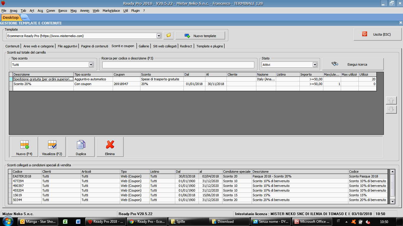 Salve, ho creato una promozione con coupon, e non riesco ad impostarla correttamente. In questo momento ho due sconti attivi sul sito: Spedizioni gratuite per spese oltre 50 euro Sconto del 20% per spese oltre 50 euro (con coupon)
