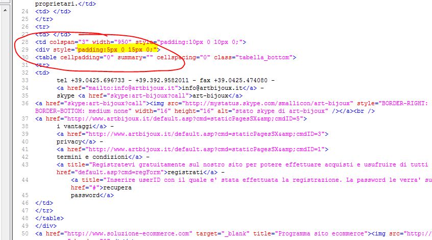 Gentile staff di Ready, stiamo cercando di personalizzare al meglio il vostro template standard per l'ecommerce. L'uso dei fogli CSS personalizzabili ci da parecchia libertà, però ci stiamo scontrando con un problema che non riusciamo a risolvere su tutti i browser. Aggiungendo infatti del codice HTML nel foot, con un'immagine di sfondo, questa risulta abbassata (con tutto il codice HTML) di 15px, a causa dei comandi che vedete in allegato, e che credo siano parte integrante del codice, e non arrivano dagli stili. Ovviando con un margin della mia tabella in negativo, ovvio al problema su Opera e Firefox, ma non su IE. Avete una soluzione per questo? Se non l'avete, ed effettivamente è uno stile intrinseco nell'ASP, vi consiglio di prenderlo in considerazione per la produzione del prossimo template standard. Grazie della collaborazione, Manuel