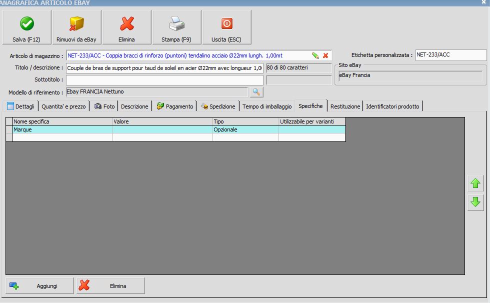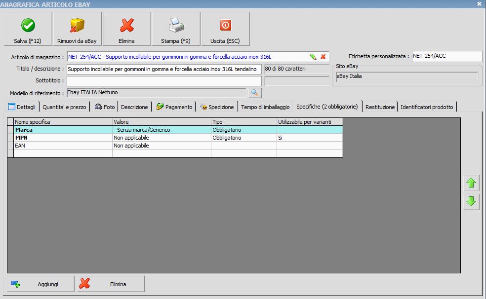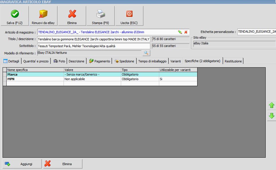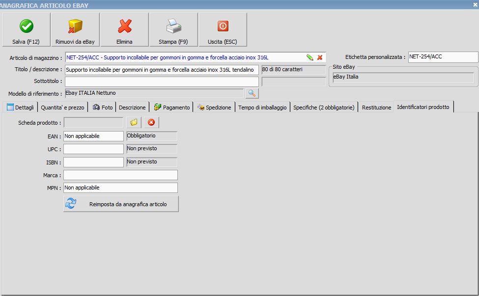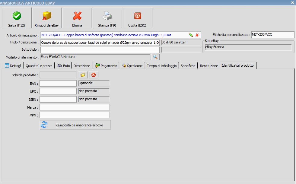 Come da voi segnalato giorni fa ho fatto la procedura per aggiornare identificatori di prodotto...e in effetti su Ebay nel riquadro "Migliora le inserzioni" non mi vengono più segnalate(allego screenshot). Ma riguardano le inserzioni Ebay caricate su Ready mi vengono dei dubbi. Gli identificatori di prodotto obbligatori, come spiegato nelle pagine informative di Ebay, sono Marca,MPN e EAN. Allego screenshot di 2 inserzioni diverse su Ebay Italia. Nella prima inserzione (supporto incollabile...)nella scheda specifiche sono presenti MARCA,MPN,EAN....la dicitura senza marca/generico è corretta???? Nella scheda identificatori di prodotto la sezione MARCA è vuota...è corretto che sia così? Nella seconda inserzione (tendalino....)nella scheda specifiche non è presente codice EAN, mentre la scheda identificatori di prodotto non c'è proprio....perchè???